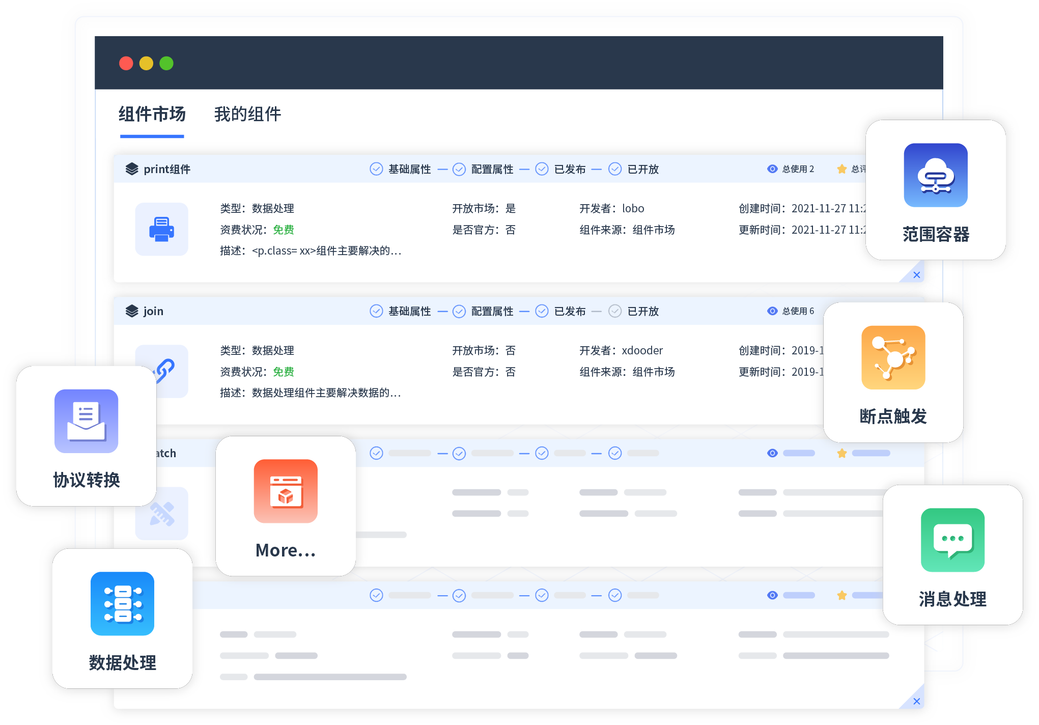 针对集成场景,凯发k8官方网站登录提供组件市场,例如协议转换、消息处理、文件操作等。除平台提供的组件外,客户可以自定义所需组件。